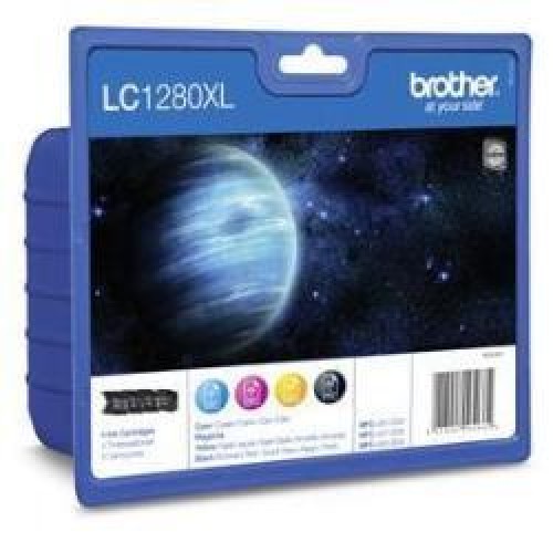 Pack de 4 cartuchos de tinta Brother LC1280XLVALBP de alta capacidade para impressoras a jato de tinta. Ideal para impressão de grandes volumes, oferecendo rendimento para até 2400 páginas (preto) e 1200 páginas (cores). Compatível com vários modelos de impressoras Brother. Embalagem blister sem alarme.