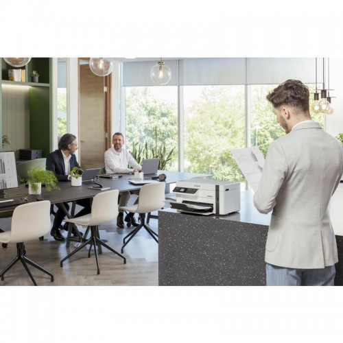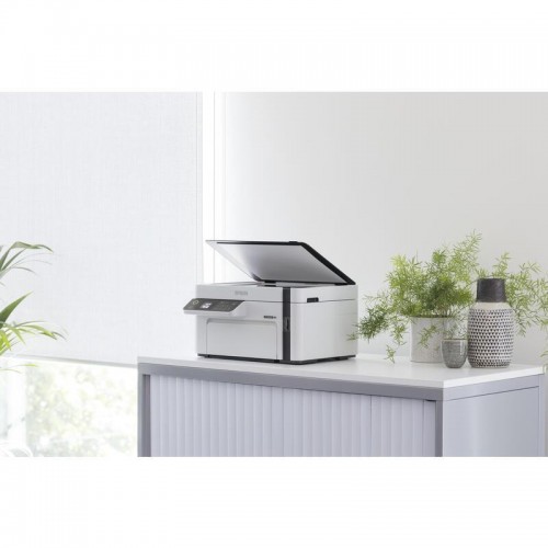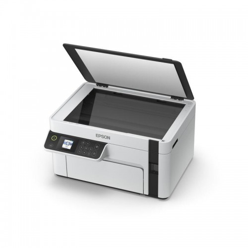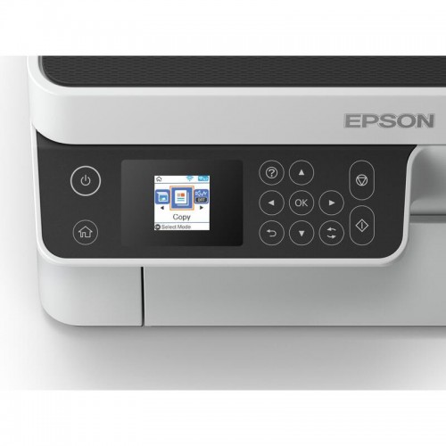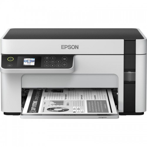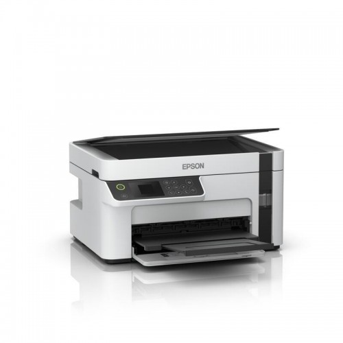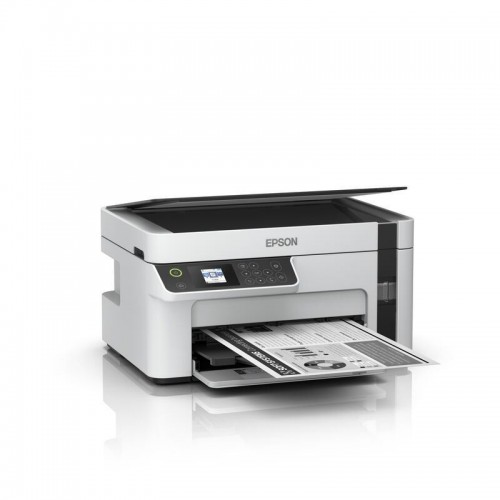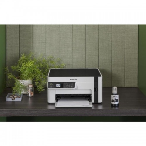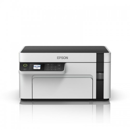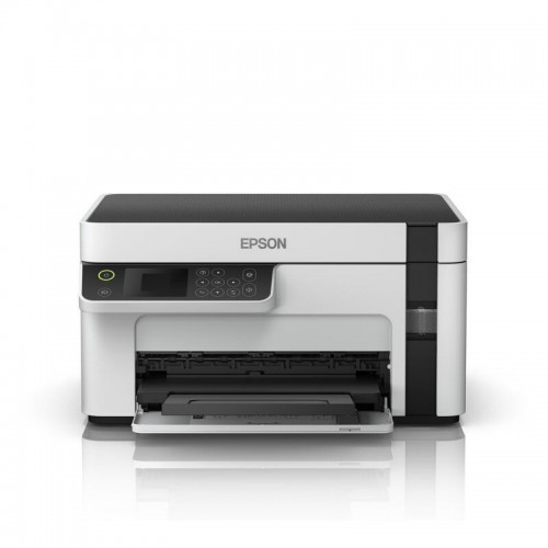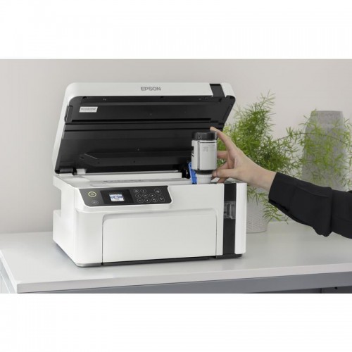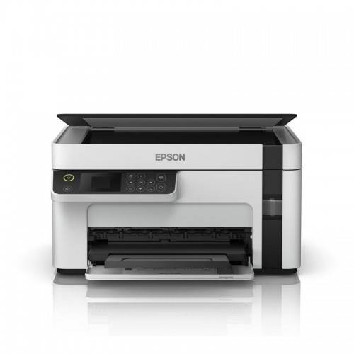 Impressora multifuncional Epson EcoTank ET-M2120 monocromática para impressão, cópia e digitalização de documentos A4. Tecnologia de jato de tinta, resolução máxima de 1440 x 720 DPI para impressão e 2400 x 1200 DPI para digitalização. Conectividade Wi-Fi e impressão directa. Design em preto e branco.