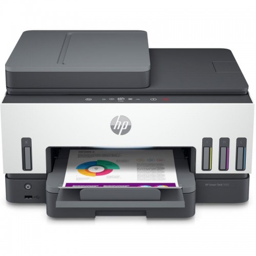 HP Smart Tank Multifunções 7605, Cor, Impressora para Casa e escritório em casa, Impressão, cópia, digitalização, fax, ADF e ligação sem fios, ADF para 35 folhas; Digitalização para PDF; Impressão frente e verso. Tecnologia de impressão: Jato de tinta térmico, Impressão: Impressão a cores, Resolução Máxima: 4800 x 1200 DPI, Velocidade de impressão (cores, qualidade normal, A4/US Letter): 9 ppm. Cópia: Cópia a cores, Resolução de cópia máxima: 600 x 600 DPI. Digitalização: Digitalização a cores, Resolução óptica de digitalização: 1200 x 1200 DPI. Envio de fax: Fax a cores. Funções duplex: Fax. Dimensão máxima de papel ISO A-series: A4. Wi-Fi. Impressão directa. Cor do produto: Cinzento ;
