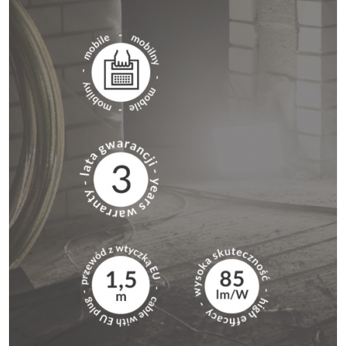 A estrutura em alumínio proporciona resistência à corrosão e impactos, enquanto o vidro temperado protege o LED de choques e impactos externos. O design inclui pegas forradas em espuma macia, para transporte fácil e confortável, mesmo em ambientes de trabalho. O comprimento do cabo de 1,5m oferece flexibilidade na colocação. O peso de 1010g permite a sua portabilidade.